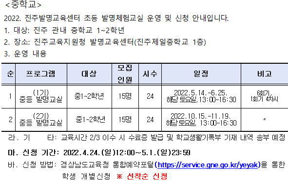 2022. 진주발명교육센터 중등 발명체험교실 운영 계획 및 신청 안내