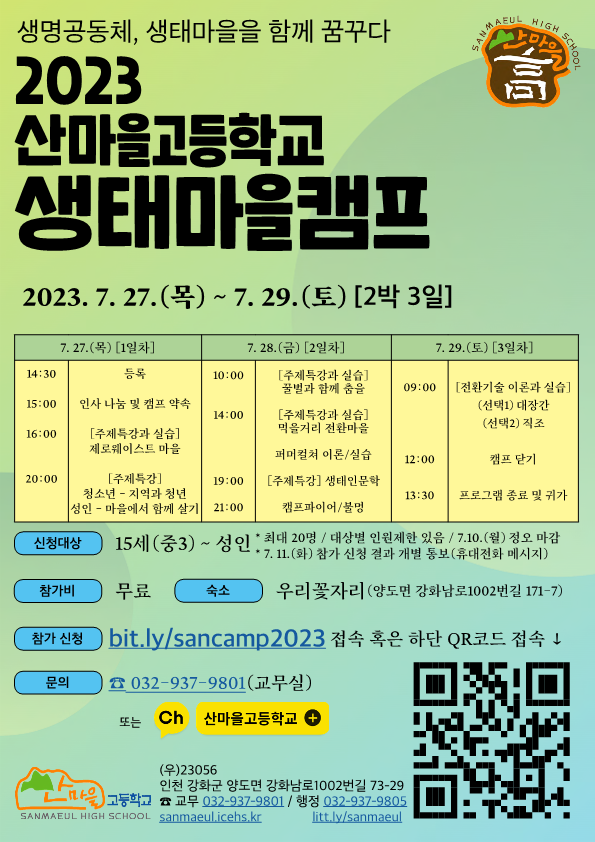 ‘자연·평화·상생의 교육공동체’산마을고등학교에서<2023학년도 생태마을캠프>를 다음과 같이 개최하오니, 관심있는 구성원들의 많은 참여 바랍니다. - 행 사 명 :2023학년도 산마을고등학교 생태마을캠프 - 주 제 : ‘생명공동체, 생태마을을 꿈꾸다’ - 기 간 :2023. 7. 27.(목) ~ 7. 29.(토)[2박 3일] - 대 상 :15세(중3) ~ 성인(최대 20명/대상별 인원제한 있음) - 참 가 비 : 무료 - 참가신청 :https://bit.ly/sancamp2023에 접속하여 신청(이벤터스) (신청 기간 : 2023. 6. 26.(월) 12:00 ~ 7. 10.(월) 12:00) (7. 11.(화) 참가 신청 결과 개별 통보(휴대전화 메시지)) - 주요 프로그램, 숙소 등 기타 사항 : 붙임 파일 참조 - 문의 : 교무실 ☎032-937-9801 혹은카카오톡 채널 ‘산마을고등학교’ 붙임 2023 생태마을캠프 홍보 포스터.PDF 1부. 끝.