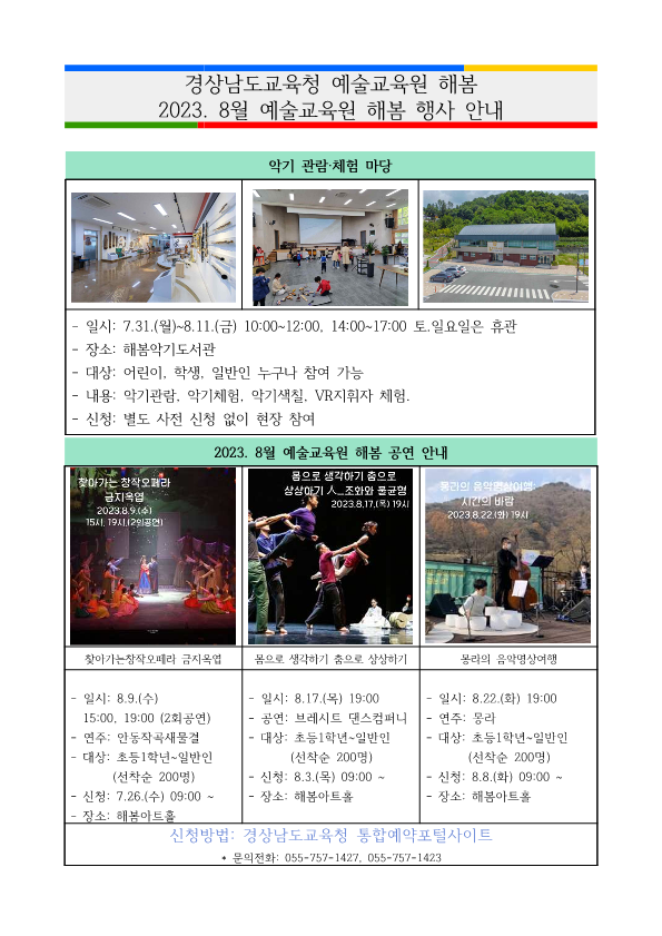 경상남도교육청예술교육원해봄에서는 2023년 1학기 방학을 맞이하여 8월에 아래와 같은 행사를 진행하고자 하오니 많은 학생들의 참여 바랍니다. - 예술교육원 해봄 8월행사- 구분 | 프로그램명(내용) | 일시(기간) | 관람.체험 행사 | 해봄악기도서관 자유관람 “악기산책” ·악기관람 및 악기체험 - 국악기, 서양악기, 세계악기 관람 - 다양한 악기 체험 및 연주 기회 제공 - 악기 지휘자 체험 - 악기 색칠하기 | 7.31.(월)~8.11.(금) 토.일요일 휴관 10:00~12:00 14:00~17:00 | 초청공연 | 찾아가는창작오페라 금지옥엽 (오페라 갈라콘서트) | 8.9.(수) 15:00,19:00 (2회공연) | 신나는 예술여행 | 몸으로 생각하기 춤으로 상상하기 | 8.17.(목) 19:00 | 몽라의 음악명상여행 | 8.22.(화) 19:00 |