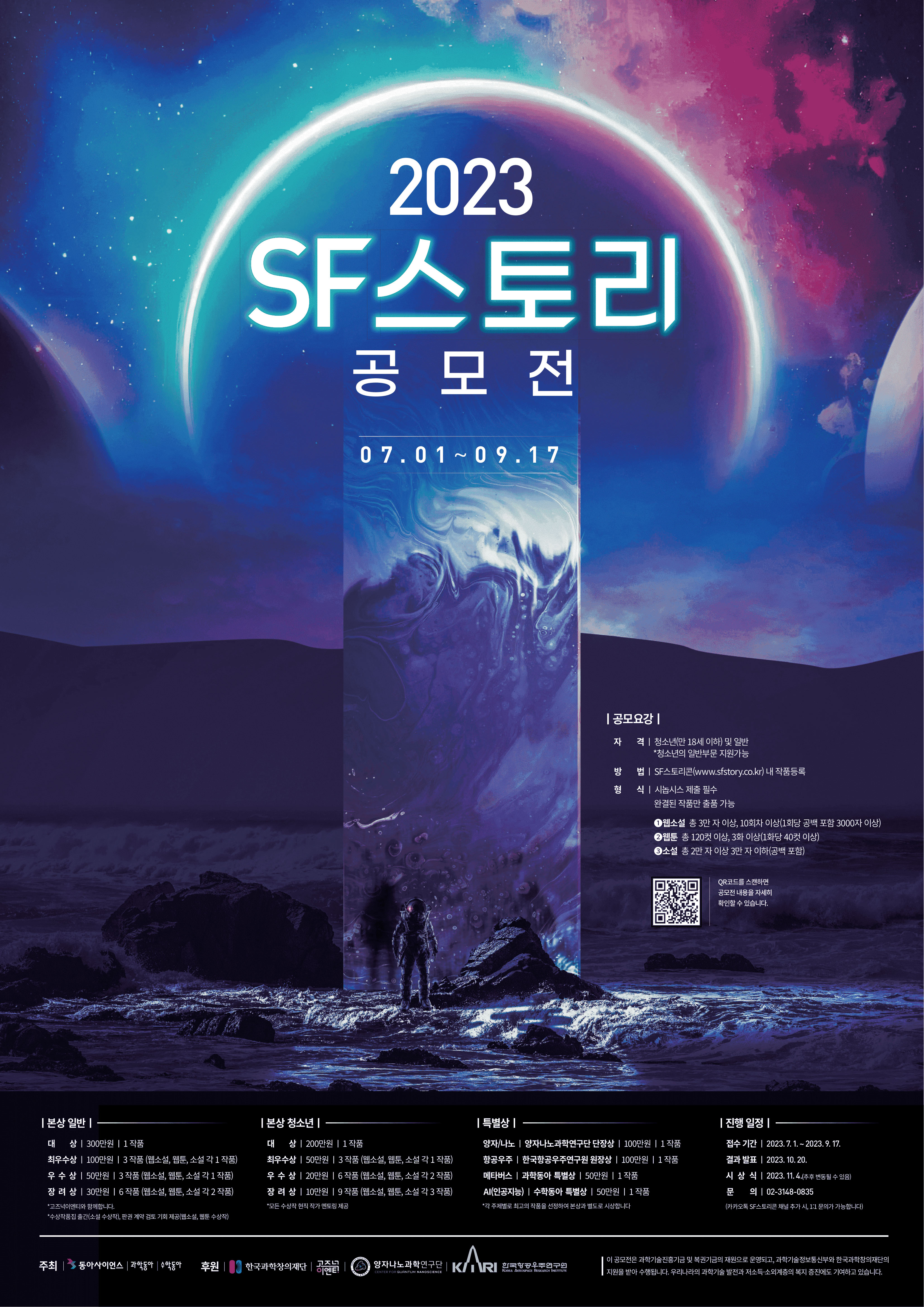 여름방학 중 활동으로 추천할만한 2023 SF스토리 공모전이 아래와 같이 개최됩니다. 가. 공모 개요 1) 공모전명: 2023 SF스토리 공모전 2) 공모 기간: 2023.7.1. ~ 2023.9.17. 3) 공모 분야: SF장르의 웹소설·웹툰·소설 (선택) 4) 공모 대상: 일반 성인 및 청소년 나. 시상 및 특전 1) 일반 부문 : 수상작품집 출간(소설 수상작에 한함) 및 판권 계약 검토(웹소설·웹툰 수상작에 한함) 2) 청소년 부문 : 현직 작가 멘토링 제공 3) 특별상 : 본상과 구분하여 주제별 우수한 작품 선정하여 시상 양자나노과학연구단, 한국항공우주연구원 등 연구기관장상 수여 4) 상금: 수상자 전원 상금 별도 지급 다. 주최 기관 1) 주최 : 동아사이언스 2) 주관 : 과학동아, 수학동아 3) 후원 : 한국과학창의재단, 고즈넉이엔티, 양자나노과학연구단, 한국항공우주연구원 라. 공모전 홈페이지:www.sfstory.co.kr 붙임 1: 2023 SF스토리 공모전 상세 내용 붙임 2: 2023 SF스토리 공모전 포스터 jpg 붙임 3: 2023 SF스토리 공모전 포스터 pdf