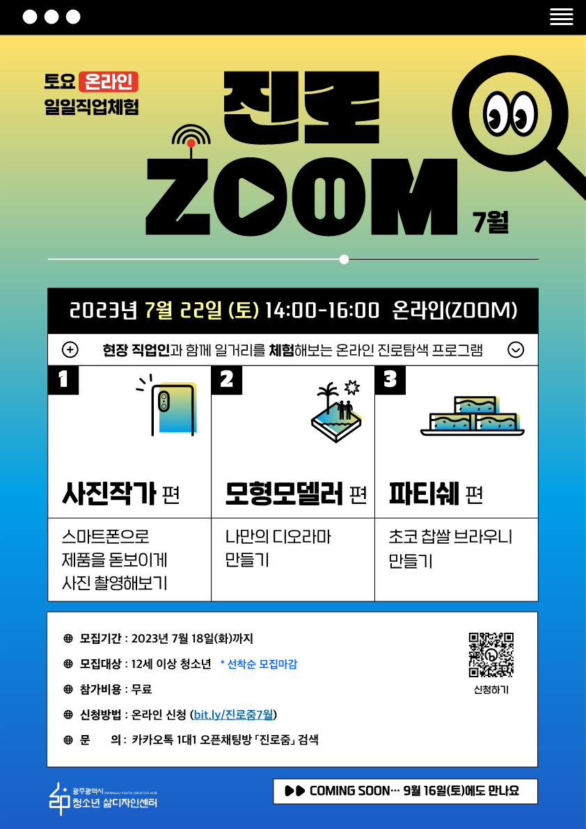 - 다 음 - 가. 프로그램 개요 1) 일시 : 2023. 7. 22.(토) 14:00~16:00 2) 장소 : 온라인(ZOOM) 3) 내용 - 사진작가 편 : 스마트폰으로 제품을 돋보이게 촬영해보기 - 모형모델러 편 : 나만의 세계, 디오라마 제작하기 **키트제공 - 파티쉐 편 : 초코 찹쌀 브라우니 만들기 **키트제공 나. 모집 개요 1) 기간 : 2023. 7. 18.(화)까지 2) 대상 : 12세 이상 청소년 3) 비용 : 무료 4) 방법 : https://bit.ly/진로줌7월 ※선착순마감 5) 문의 : 062-224-0544(화~토, 10:00~19:00) 진로팀 보또 붙임 1. 토요온라인_일일직업체험_7월진로줌_안내문 1부 2. 토요온라인_일일직업체험_7월진로줌_포스터 1부. 끝.