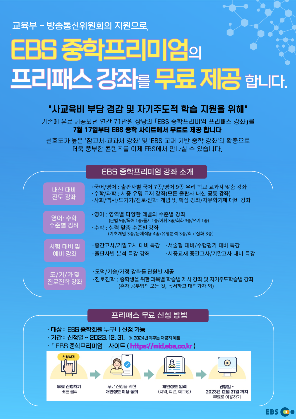 2023년 「EBS 중학 프리미엄 콘텐츠 무료 제공」사업에 대해 아래와 같이 안내하니, 도내 전 중학생의 많은 활용 바랍니다.