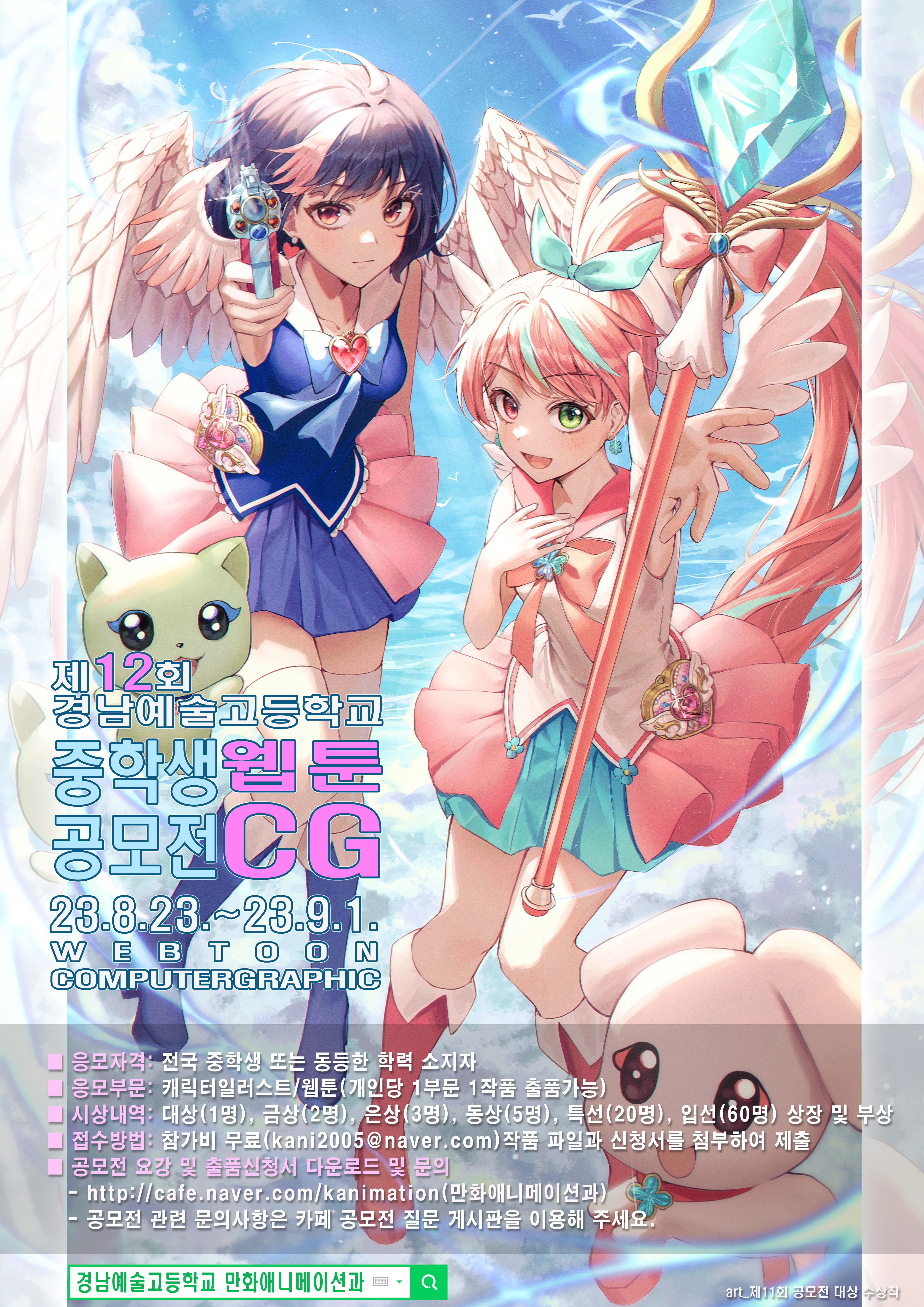 가. 행 사 명: 제12회 경남예술고등학교 주최 전국 중학생 웹툰, CG공모전 나. 응모자격: 전국 중학교 재학생 또는 홈스쿨링을 포함한 동등한 학력 소지자 다. 응모부문: 웹툰, 캐릭터일러스트 라. 접수기간: 2023. 8.23.(수)부터~2023.9.1.(금)까지 이메일 접수 마. 시상내역: 대상1명 외 90명(상장 및 부상) 바. 참 가 비: 무료 사. 시상자발표: 2023. 9.27.(수)이전 본교 홈페이지, 카페 발표 예정 붙임 1. 제12회 경남예술고 중학생 웹툰 CG 공모전 출품신청서 1부. 2. 제12회 경남예술고 중학생 웹툰 CG 공모전 요강 1부. 3. 2023 경남예고 중학생 웹툰 CG 공모전 포스터 1부. 끝.