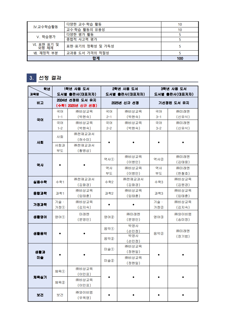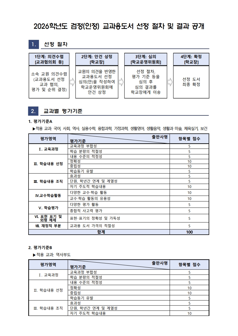 2026학년도 검정(인정) 교과용도서 선정 절차 및 결과 공개